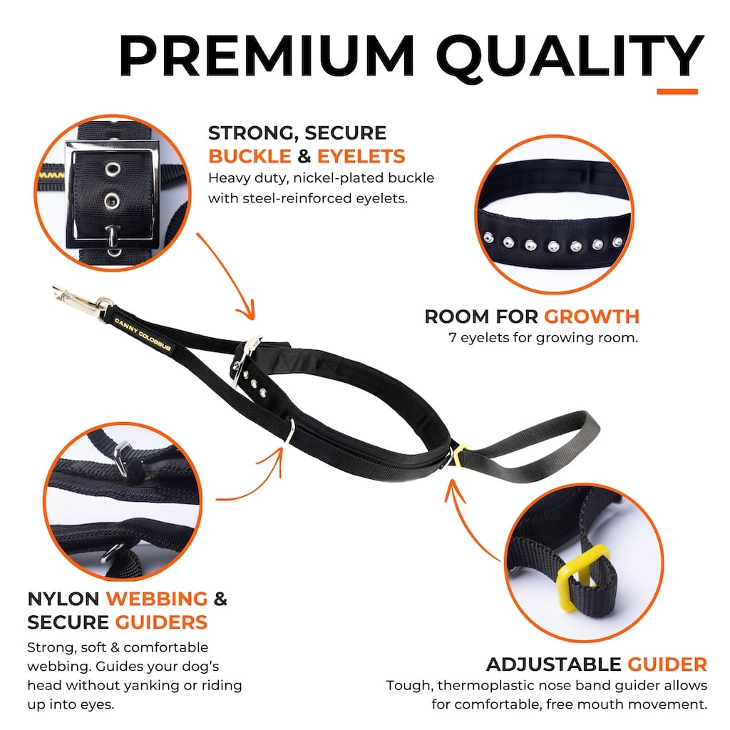 Stress-free walks with no frustration, embarrassment or fear of being pulled over: The Canny Colossus is the best no pull dog head collar to train your large or giant breed dog to walk well on lead.